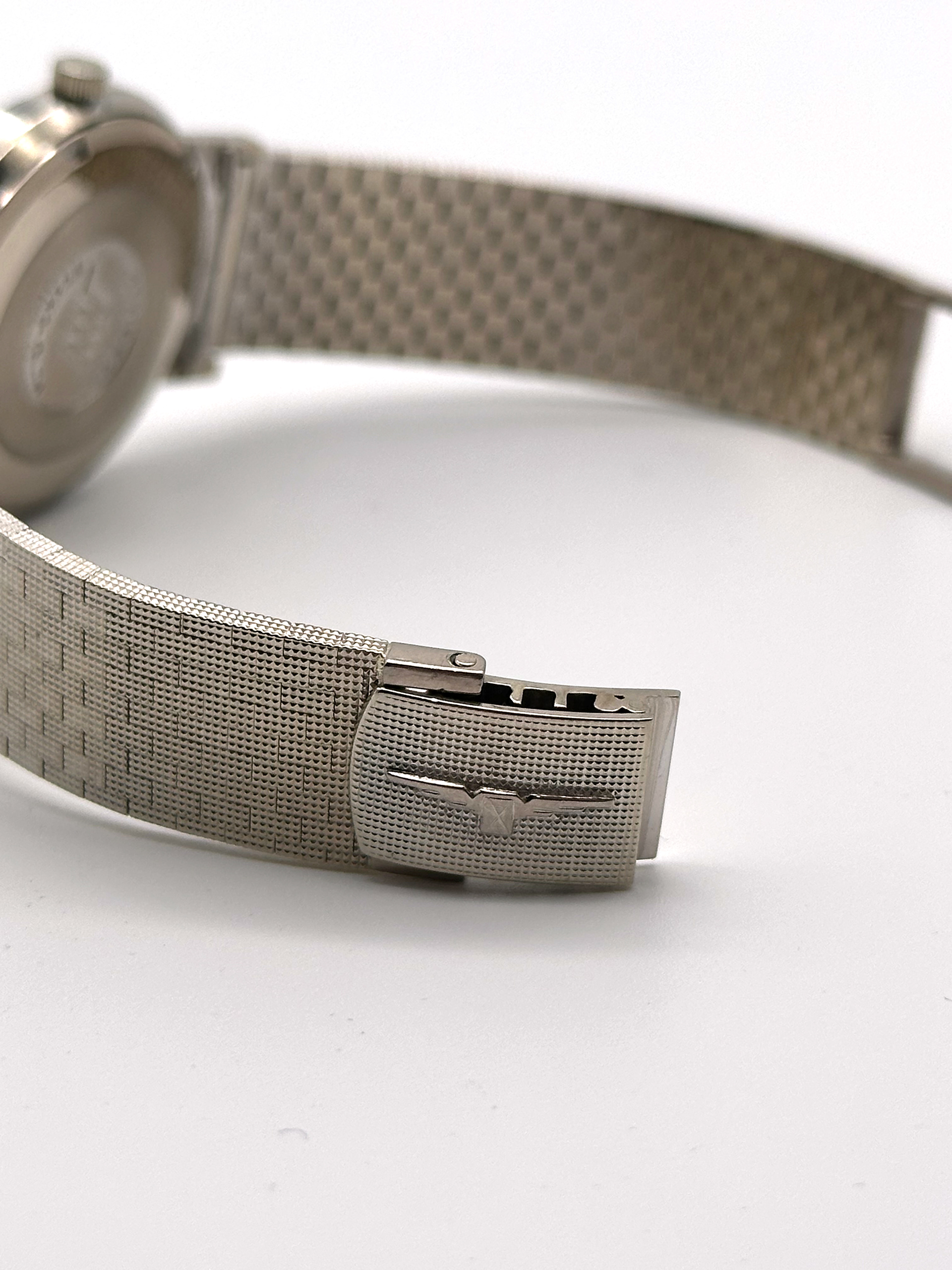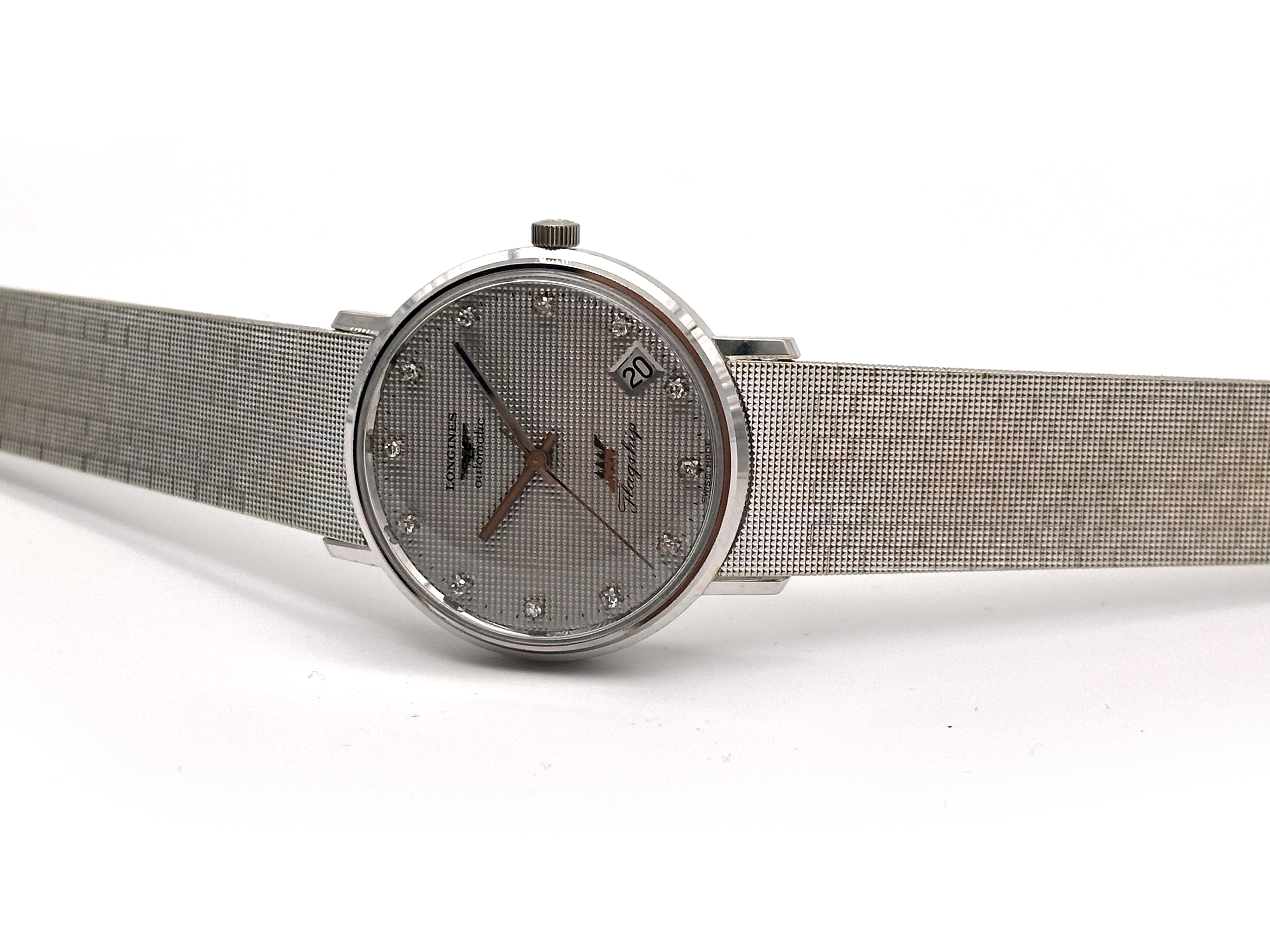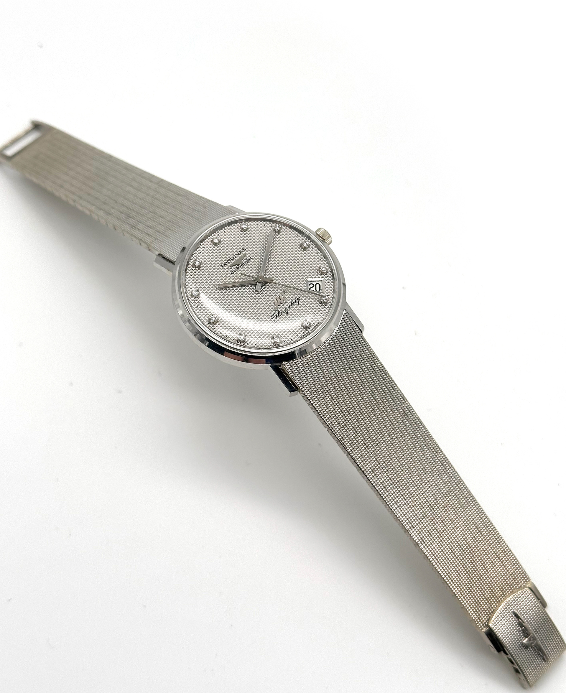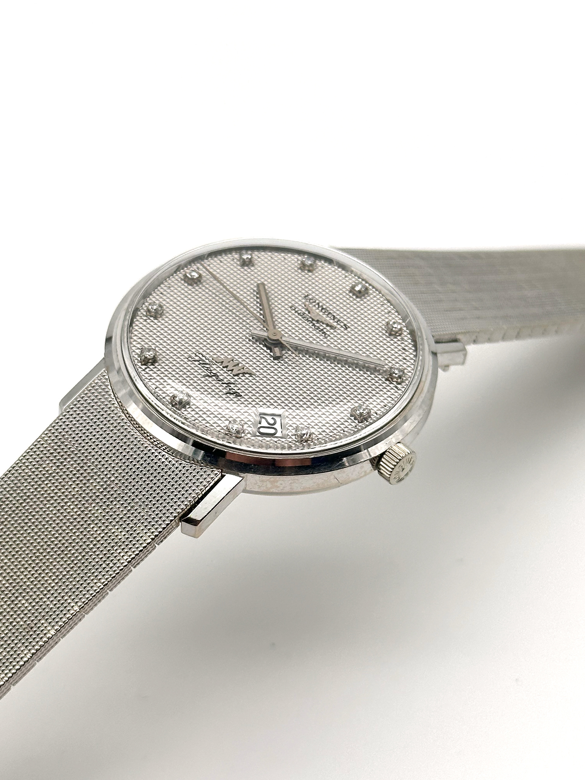 De kast, band én wijzerplaat van deze Longines Ultra-Chron Flagship zijn gemaakt van 18 karaats witgoud.