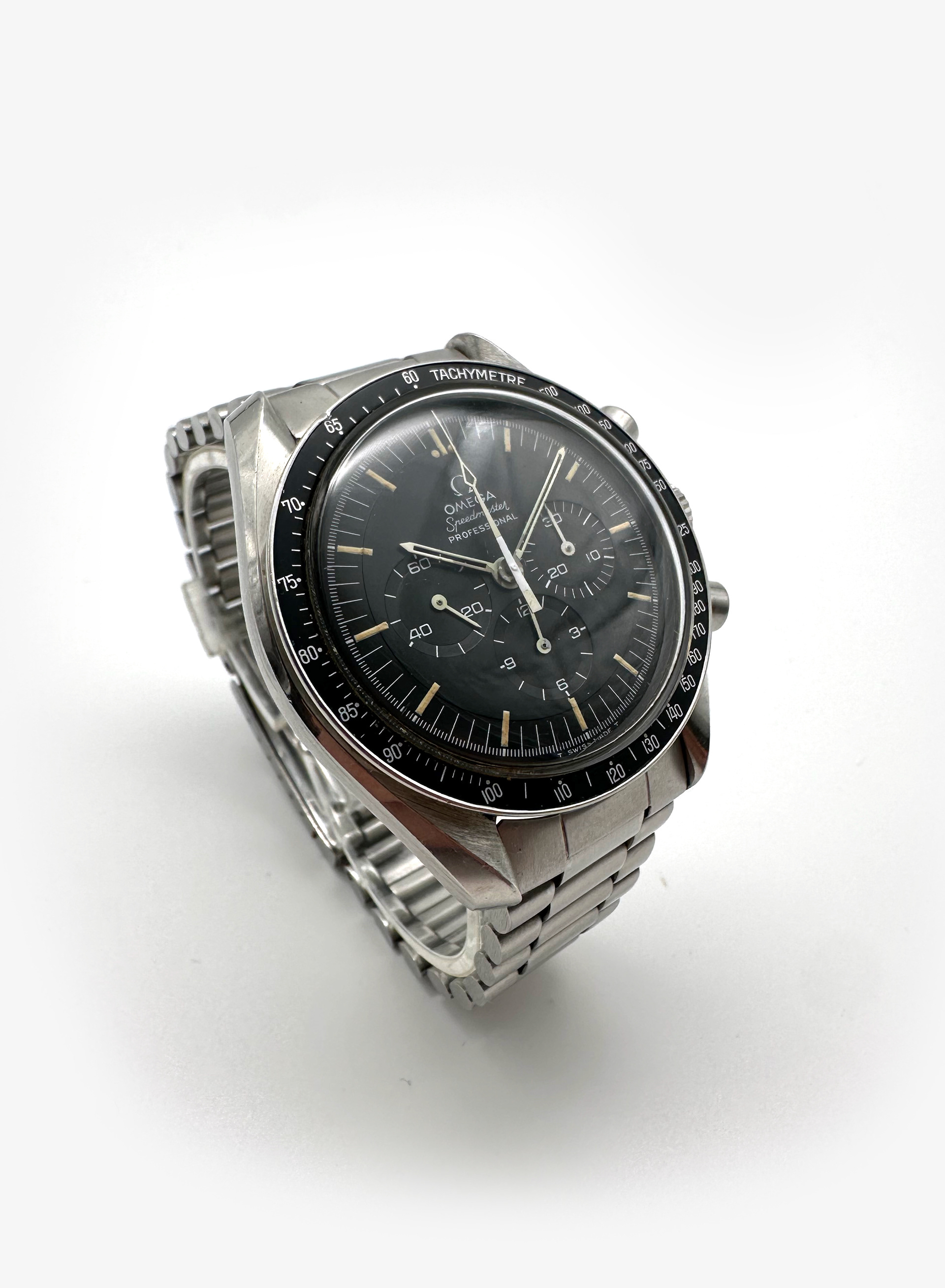 Deze Speedmaster Professional komt uit 1971 en verkeert in strakke staat. De kast is zeer netjes en is voorzien van een periode correcte band. Dit laatste feit is steeds vaker zeldzaam te noemen. Het horloge heeft draagsporen rondom. Op de bezel bij 65 zit een deukje. Daarnaast is het tritium in de wijzers verdwenen en is de witte verf hiervan niet overal meer aanwezig. Wij hebben ervoor gekozen om dit zo te laten in het kader van originaliteit.